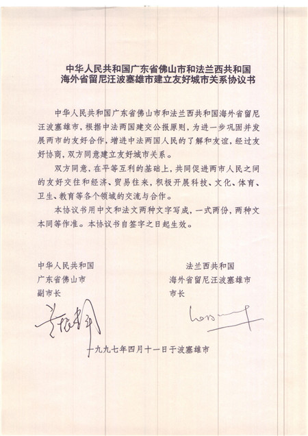 我市与法属留尼汪波塞雄市于1997年4月11日建立友好城市关系。