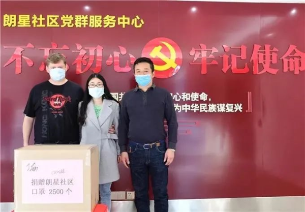德籍工程师HAPP GUIDO先生与妻子向九江朗星社区赠送2500个口罩,他说:“在我们两个最无助的时候,社区一直在帮助我们,非常感谢。”