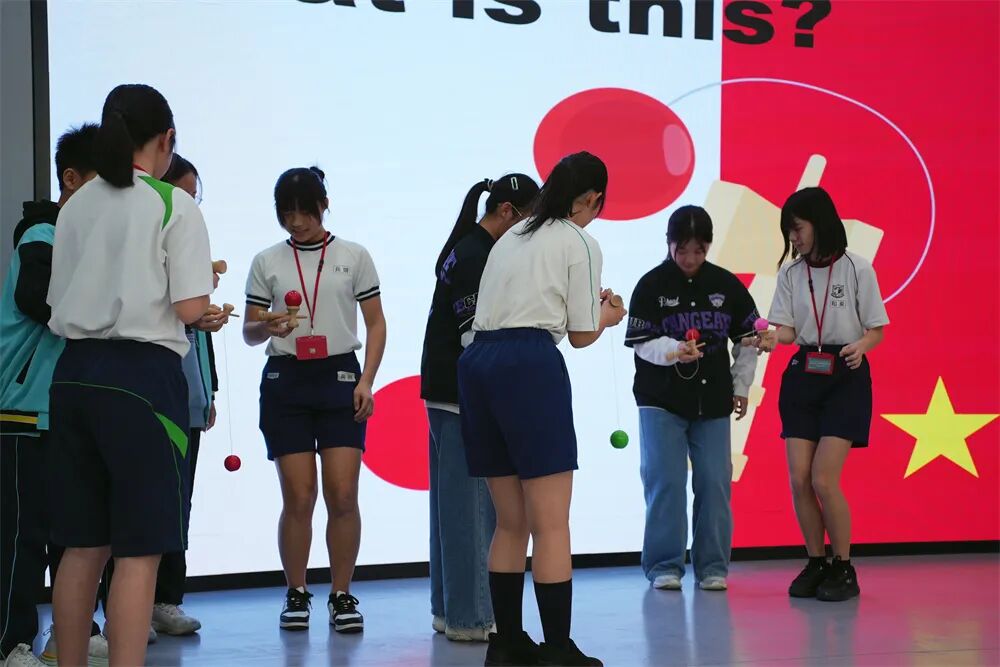 在金沙娱乐城实验学校,伊丹学生们体验金沙娱乐城学生的物理课,分享日本传统玩具剑玉。