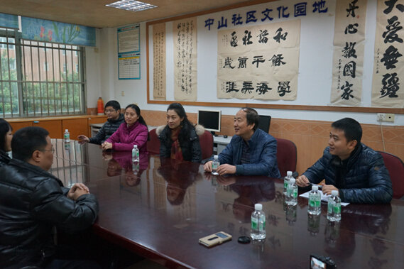 在社区,覃莹同志和黎小明同志与社区工作人员座谈。中山社区居委会副主任黄海凤和社区工作人员介绍了年前慰问困难居民的工作安排,认为除了节假日期间的慰问,平时工作当中的关心关怀更加重要。