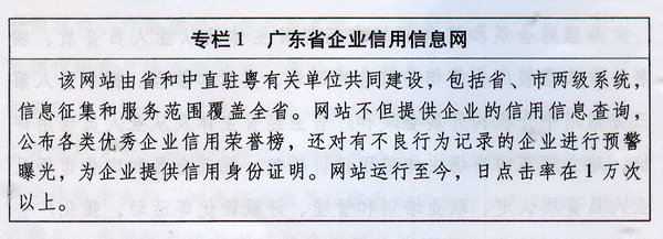 ——公共信用信息系统平台建设及应用取得良好成效。金融信用信息基础数据库采录我省的信用主体数量和我省信用报告查询量均居全国前列。大力推进中小企业和农村信用体系建设,截至2013年底,累计为36万户中小企业和253万户农户建立信用档案。开通运行“广东省企业信用信息网”,初步建成事业单位跨部门信息数据共享平台。