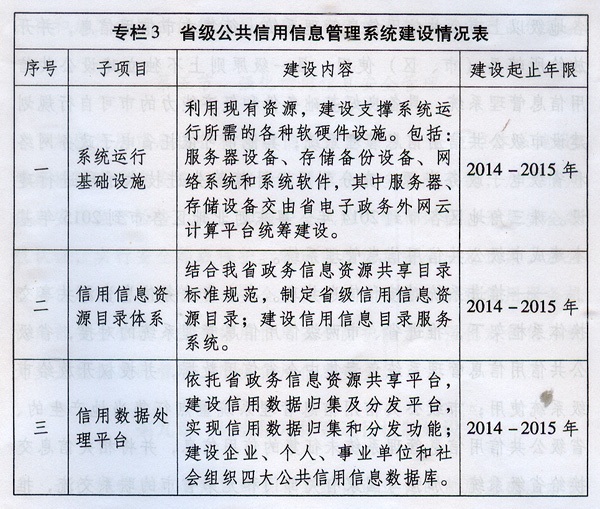 信用信息系统建设是社会信用体系建设的基础性工程。充分利用现代信息技术,按照统一的信用信息标准和技术规范,强化对社会成员信用信息的记录、整合、共享和交换,为信用信息的应用提供载体和平台。到2015年,建成省、市两级联通的公共信用信息管理系统;到2020年,建成覆盖所有社会成员的公共信用信息数据库。
