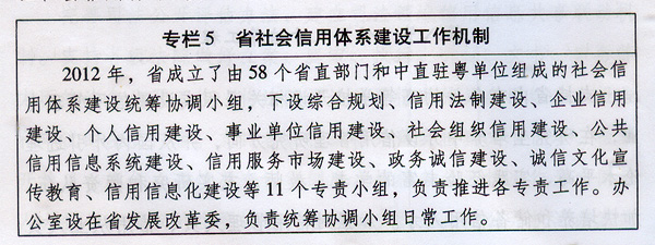 ——工作协调机制基本建立。先后建立社会信用体系建设省级联席会议制度,成立省社会信用体系建设统筹协调小组,出台《广东省建设社会信用体系工作方案》,明确建设工作任务和步骤。各市相应建立了信用体系建设工作协调机制。