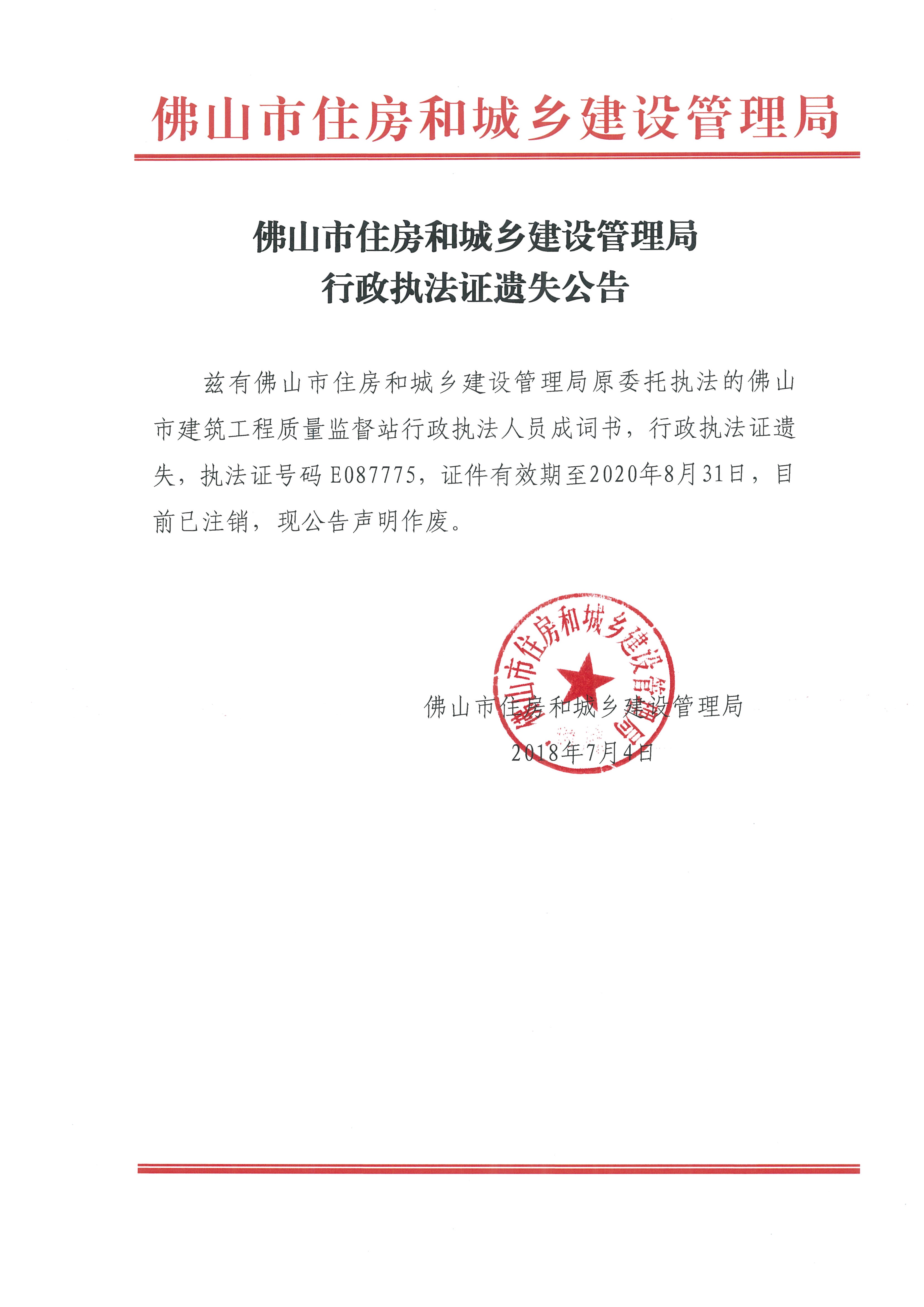 金沙娱乐城住房和城乡建设管理局行政执法证遗失公告