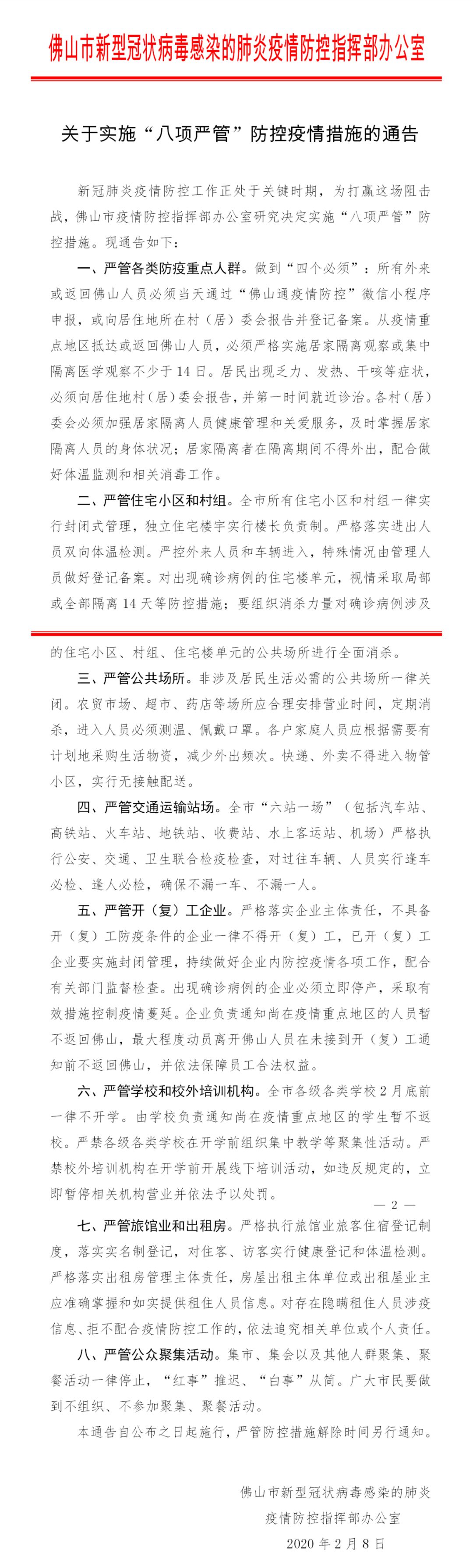 关于实施“八项严管”防控疫情措施的通告