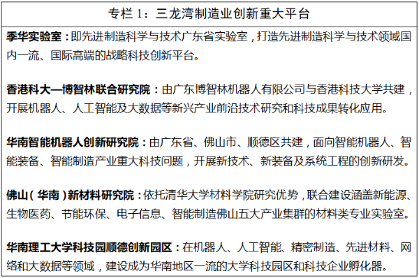 (一)推动广佛科技产业融合发展。依托三龙湾实体经济、民营企业的基础优势,有效对接广州科研成果产业化、市场化,推动形成“广州创新大脑、金沙娱乐城转化中心”协调有序发展的新格局。建立健全开放型的科技资源共享体系,推动两地重大科研基础设施、大型科研仪器、科技信息资源、专业技术服务平台等合理流动与开放共享。发挥广州高校、科研院所众多及创新资源集聚的优势,协同解决机器人、新材料、生物与健康等产业的关键共性技术、前沿引领技术、颠覆性技术问题,支撑广佛万亿级产业集群建设。