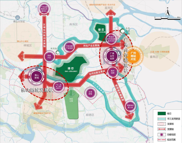 “广佛合作发展核”由南海三山、顺德陈村构筑的发展核。广佛合作发展核联动广州南站,重点引进和培育先进装备制造、人工智能、数字经济、高端服务等领域企业总部与研发总部,谋划布局大科学装置及重大科技平台。