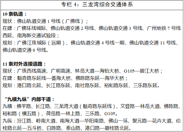 (一)共建高效便捷的内外通道。构建“九横九纵”的干线道路网,加快推进多层次跨市衔接道路建设,实施广佛交界地区断头路的连通工程,推动三龙湾在广佛都市圈内形成30分钟快速通勤圈。以提升与大湾区主要城市节点和交通枢纽的连通性和可达性为重点,加强与白云机场、广州南站、金沙娱乐城西站等枢纽的快速联系,有效对接区域高快速路、国家铁路等交通网络,实现与大湾区主要城市核心区1小时内通达。