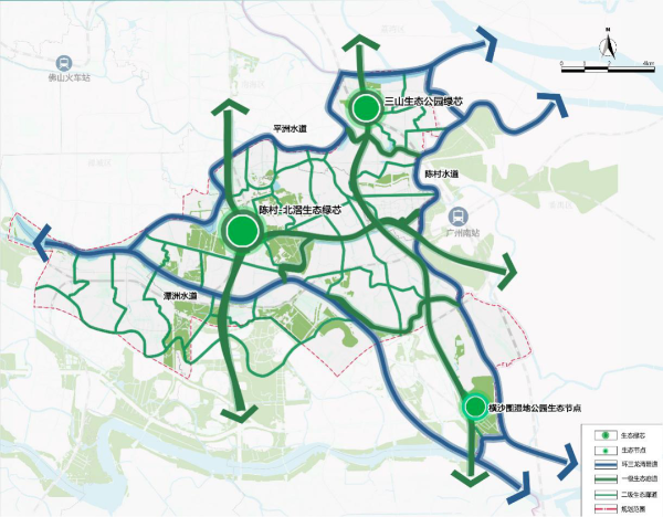 “芯”即陈村—北滘生态绿芯与三山生态绿芯。按照开放式5A级景区标准,将陈村—北滘生态绿芯塑造成为具有国际现代风貌的花卉主题公园,将三山生态公园绿芯塑造成为具有岭南特色风貌的生态休闲公园。