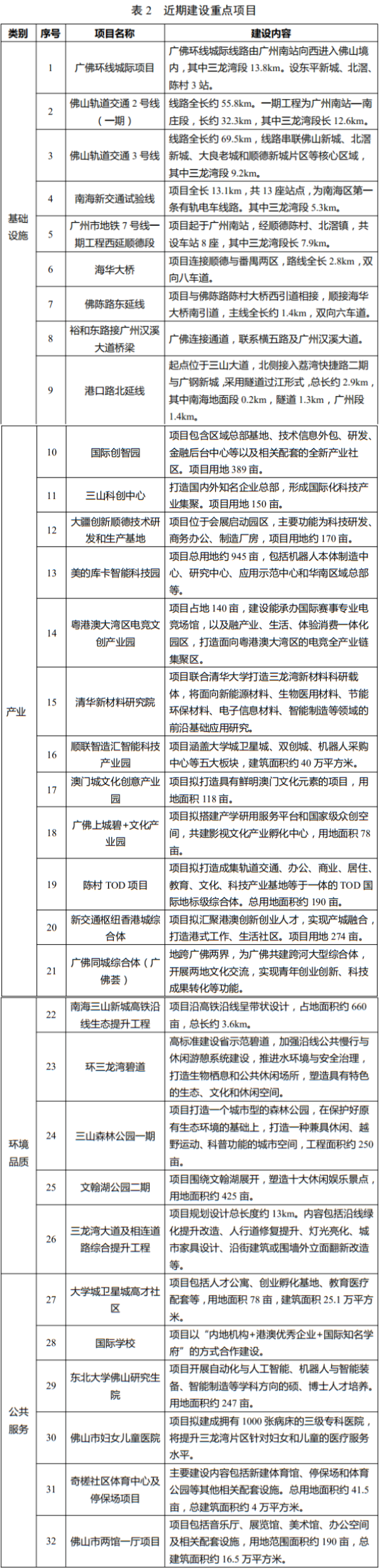 三龙湾近期建设重点项目共32项(见表2),涵盖基础设施、产业、环境品质、公共服务等四大领域。