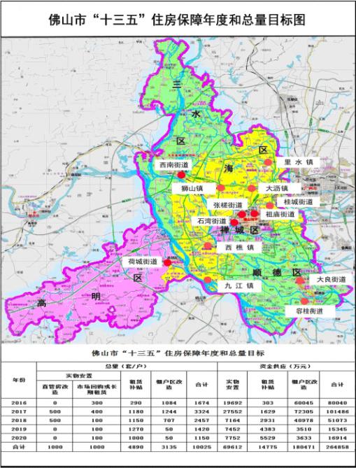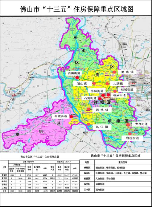 规划期内,各区应根据住房保障需求情况,确定住房保障的重点区域。以货币安置(租赁补贴)进行的住房保障应尽量做到区域均衡,特别是要弥补各区实物安置所不能覆盖的地区,最大程度惠及困难群众。具体而言,明确住房保障重点区域如下:禅城区住房保障重点区域为祖庙、张槎、石湾等镇街;南海区困难群众相对分散,住房保障重点区域为桂城、九江、西樵、狮山、大沥和里水等镇街;顺德区住房保障重点区域为大良、容桂等镇街;高明区住房保障重点区域为荷城街;三水区住房保障重点区域为西南街。