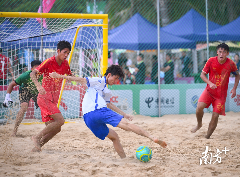 在阳江海陵岛螺洲海滨公园,十五运会群众赛事沙滩足球项目决赛展开激战。来自全国的22支队伍齐聚于此,赤足在金色沙滩上奋力争抢,碧海蓝天间扬起的不只是细沙,更是全民健身的激情浪花……一幕幕火热场景,奔涌着全民健身的非凡活力。