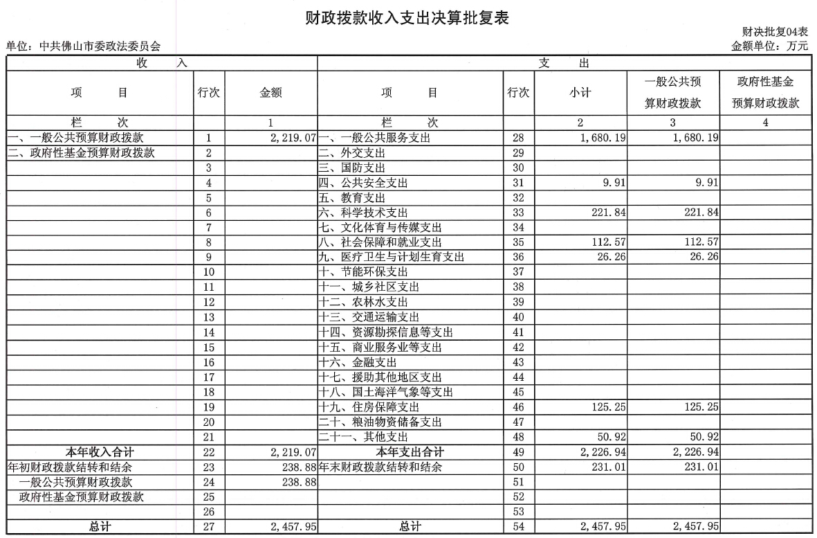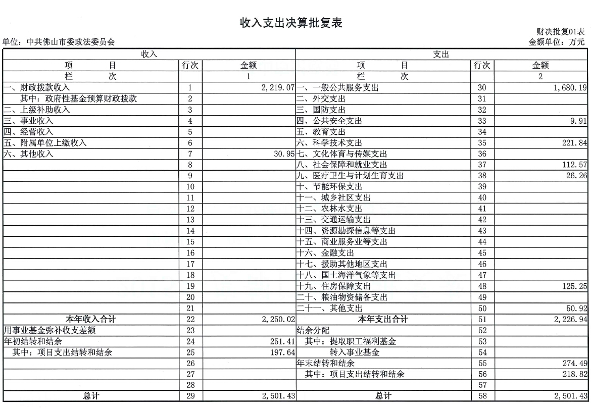 市委政法委2015年收支总决算2501.43万元,其中:本年收入2250.02万元;本年支出2226.94万元,用事业基金弥补收支差额为0万元,结余分配0万元,年末结转和结余274.49万元。
