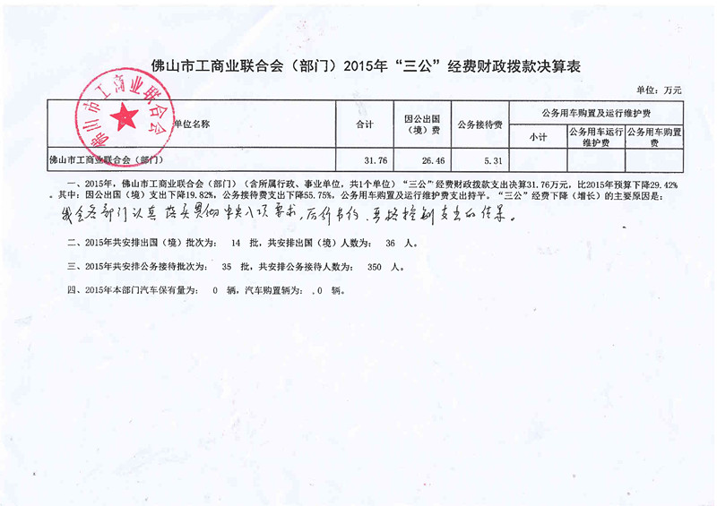 金沙娱乐城工商业联合会2015年“三公”经费财政拨款决算表