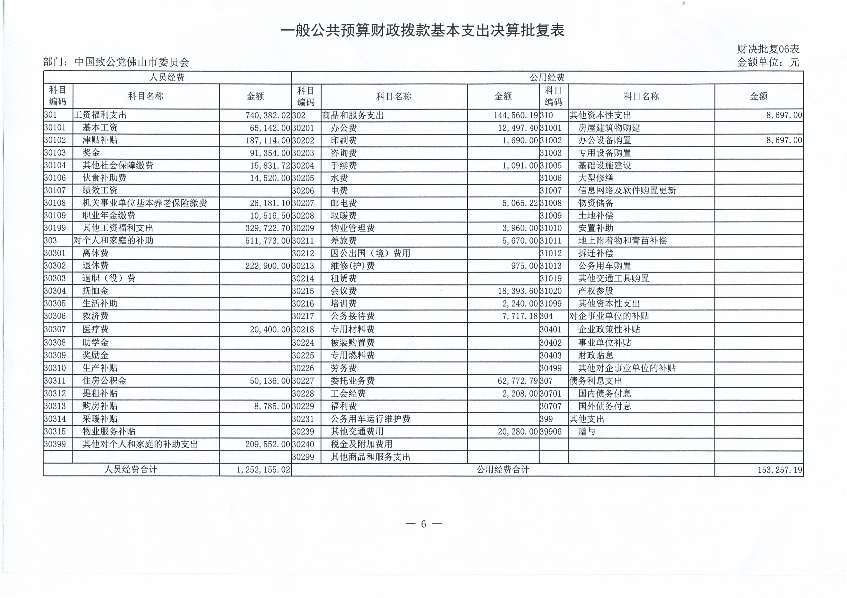 六、 一般公共预算财政拨款基本支出决算表