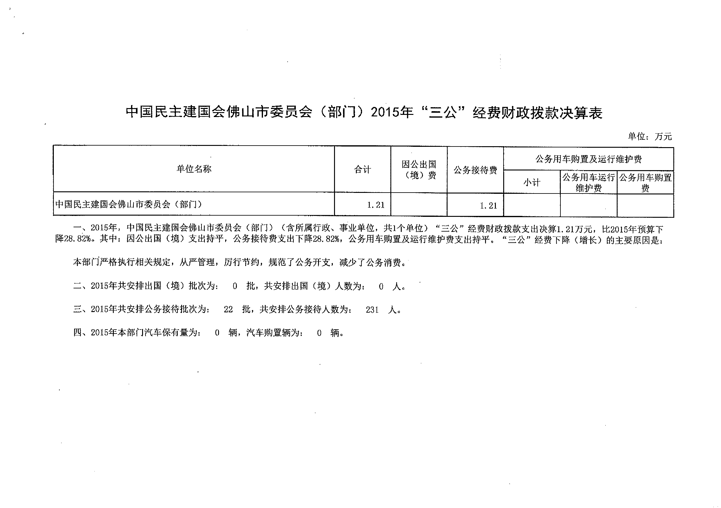 中国民主建国会金沙娱乐城委员会(部门)2015年“三公”经费财政拨款决算表
